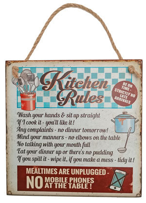 This At Home Vintage Sign - Kitchen Rules is the perfect way to enhance your kitchen's décor with a timeless, classic look. Constructed of MDF and decorated with a vintage-style printed sign, it measures 18cm x 18cm for a perfect fit in any space. With this sign, make sure everyone knows the kitchen rules!
