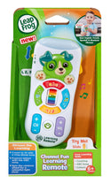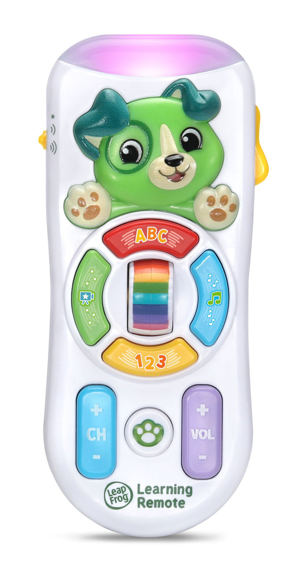 Stream the learning with the Leapfrog Channel Fun Learning Remote™! Explore the nine buttons on this role-play remote controller to hear over 100 phrases, sounds and music while building hand strength and coordination. Flip between channels to explore engaging activities that introduce numbers and letters through pretend T.V. shows. Switch to the foreign movies channel to hear common French, Spanish and Mandarin phrases translated into English or listen and dance to salsa, disco and country music on the music channel. Need help to decide what to watch? Press the paw button and tune in to a talk show featuring phrases from your puppy pal. Don't forget to roll the rainbow spinner for a colourful light show and hear colour names too!