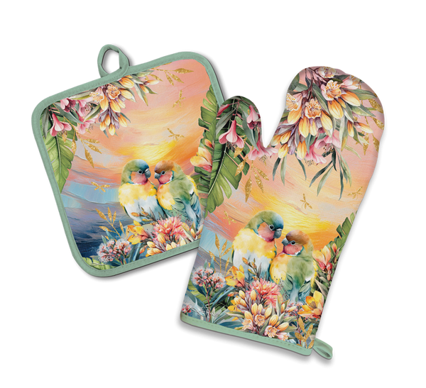 Lisa Pollock - Oven Mitt Pot Holder Set - Sunset Lovebirds