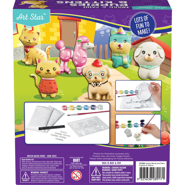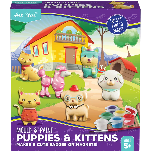 Get ready to make some fuzzy friends with Art Star Mould and Paint Puppies and Kittens! This Painting kit for kids is the perfect activity for your little ones to explore their artistic side while creating their own cute badges or magnets.