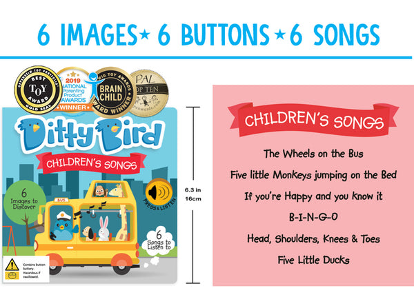 Ditty Bird books have been specifically designed to promote language skills, auditory development and music appreciation. Each book features curved corners for safety, bright colourful illustrations and children can work their fine motor skills through the engaging sound buttons. Wonderfully sturdy, these board books can be read over and over again providing easy to turn pages for little hands.