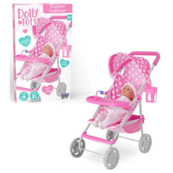 The Dolly Tots Playtime Pushchair is an ideal choice for bringing your doll along on all your exciting adventures. With a handle height of 58cm and the ability to fold flat for convenient storage, this pushchair is designed for versatility. It also comes equipped with practical features, including a cup holder for your little one's drink, a detachable feed and play table featuring a bead bar to keep your baby doll entertained, an adjustable hood, and an under-seat shopping basket to store accessories. Designed to accommodate dolls up to 45cm in size, this doll pram is perfect for fostering nurturing role-play and imaginative adventures. Suitable for children aged 3 years+.