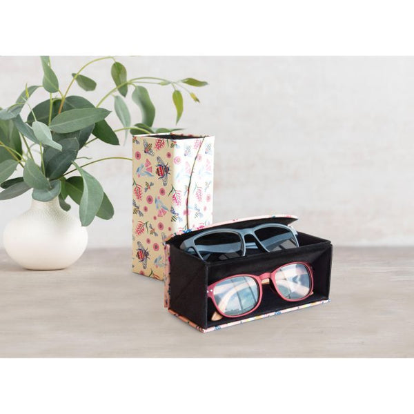 This clever case, folds neatly into a rectangle, and unfolds to reveal 2 separate lined compartments, perfect for 2 pairs of glasses.