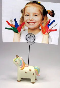A cute ceramic photo clip that features the field of dreams unicorn. Would make a great addition to any unicorn lovers bedroom decor.