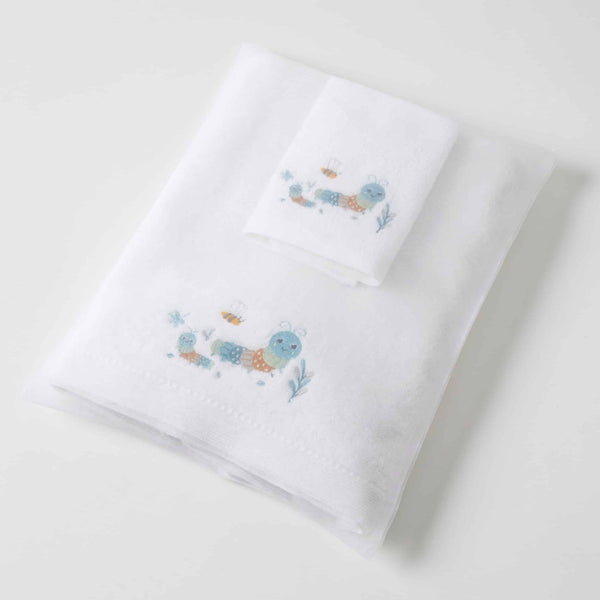 Matching Embroidered Baby Bath Towel and Face Washer presented in a delicate white Organza Bag. Perfect for gifting.