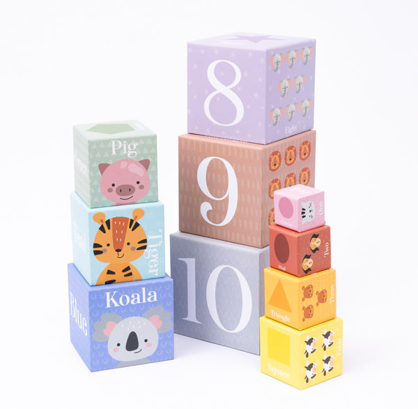 • Details: Set of 10 stacking and nesting cardboard blocks. Blocks stand 89cm tall when stacked.