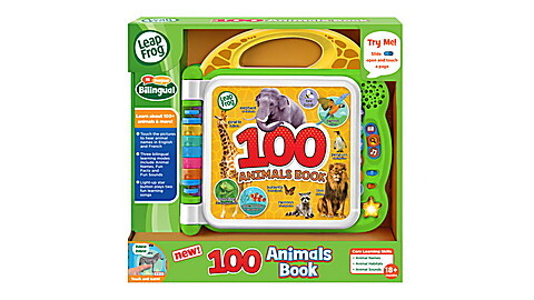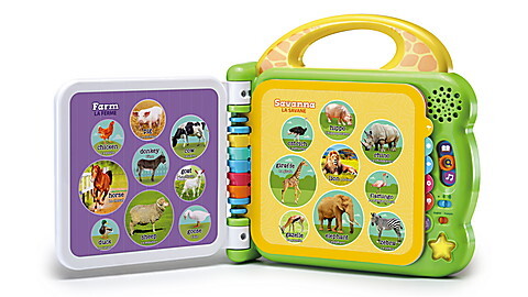 Join all the animals and explore their habitats and new vocabulary in the 100 Animals Book. Explore the colourful pages and touch each picture to hear the animals, their sounds and habitats along with exciting facts and sound effects. Immerse your child in bilingual play by sliding the language switch to hear the words, songs and instructions in French. Touch the pictures to hear fun animal facts in Fun Fact mode or press the light-up star button to hear three learning songs.