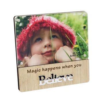 This frame has a wooden look bottom section, with a magnetic clear top to keep your precious photos safe and on display.