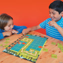 Players try to beat the ogre to the treasure by creating a path from START to END. Along the way they need to collect three keys to open the treasure. Players strategize, cooperate, and build the path together. If they do it before the ogre gets there, they all win! Kids love working together to defeat the ogre. Building onto a path encourages kids to think two steps ahead and to look at all possibilities.