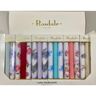Rosdale's Luxury ladies quality printed and woven handkerchiefs packaged in a practical and elegant display box. Each box containing 3 handkerchiefs in assorted vivid and pale colours. No selection is required and designs may vary from time to time.