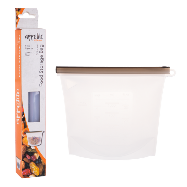 Designed with a secure slide and seal bar, the reusable Silicone Food Storage Bag from Appetito creates an airtight, leak proof bag.