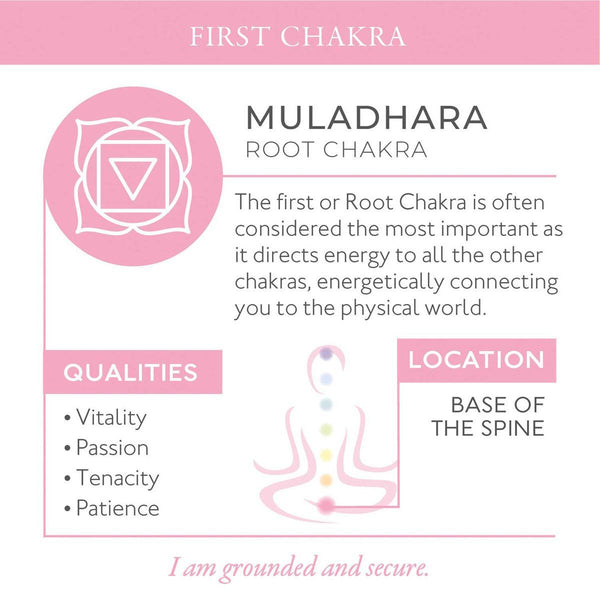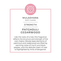 Strong and stable like the roots of a tree, this strength fragrance enhances the structure and strength of the root chakra. Elements of patchouli and cedarwood provide a woody base, while myrrh and black pepper provide warmth. A subtle centre of rose is highlighted by teases of bergamot.