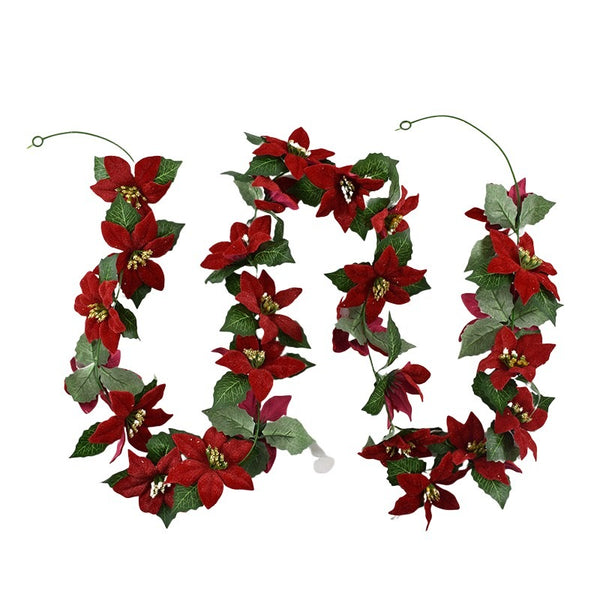 Add a touch of luxury to your holiday decor with this Velvet Poinsettia Garland with Leaves. Made with soft velvet flowers, this garland features beautiful poinsettia flowers and leaves, perfect for adding a festive and elegant look to your home. Deck the halls (and your walls) with this stunning garland.