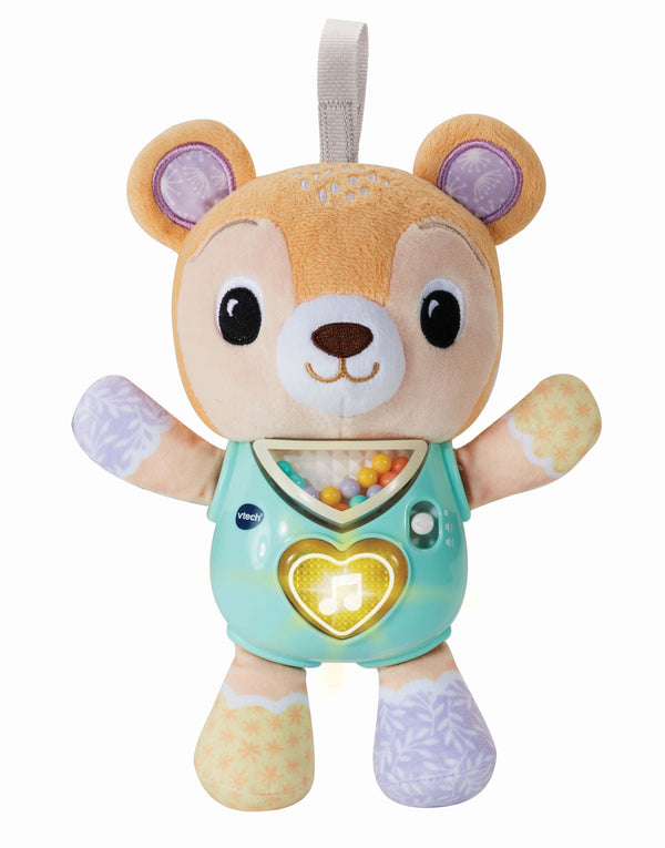 A cute cuddly bear for on-the-go play! With Cuddle & Sing Bear, baby will discover first words and feelings, music and songs. The different textures and the light up button will develop baby's sense and fine motor skills. Press the light up heart button to hear about the bear, discover feelings and listen to music. Shake the bear to hear rattle sounds. Different textures and fabrics encourage interaction. Attaches to prams or nappy bags for on-the-go play. Includes 3 sing-along songs & 15 melodies.