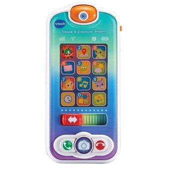 Calling all little ones! Pull out the Swipe & Discover Phone and start exploring animals, letters, numbers and words on a toy phone with cell phone-like features to encourage imaginative play with learning. Start in Video Call mode with three emoji graphics and two animals to video-call. Switch to Learning mode to find 12 pretend apps for your toddler to browse. Check the weather, click on a map, send play text messages and listen to music. As your child slides their finger from app to app, they create an on-screen pattern with lights. Keep little ones engaged in play and learning with 70+ songs, melodies, sounds and phrases.