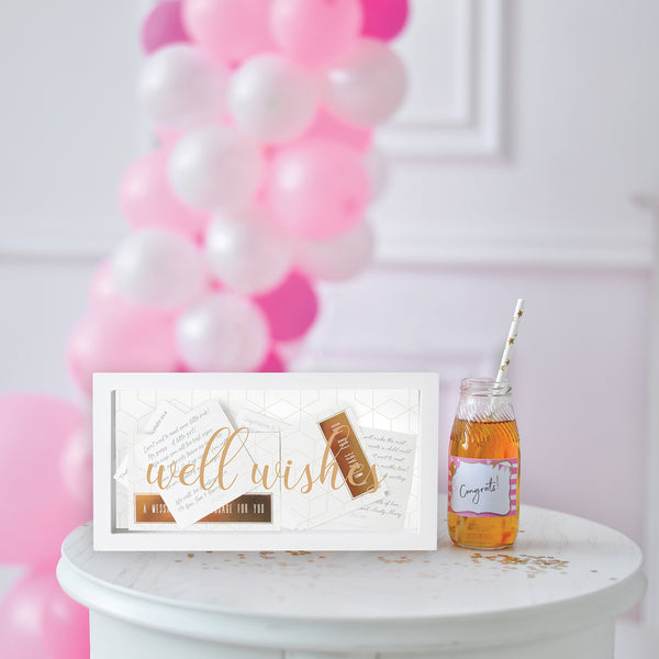 This Well Wishes Message Box from the Message Box collection is a beautiful keepsake for your special occasion. The Message Box collection is designed to collect well wishes and words of wisdom from guests at your event, to treasure forever. The messages you’ve collected will be held safely inside as a beautiful memento and reminder of those who shared it with you. Perfect for farewells, bon voyage, get well soon or any other special occasion. The Well Wishes Message Box is a unique and meaningful gift or a beautiful memento for you to add to your event.